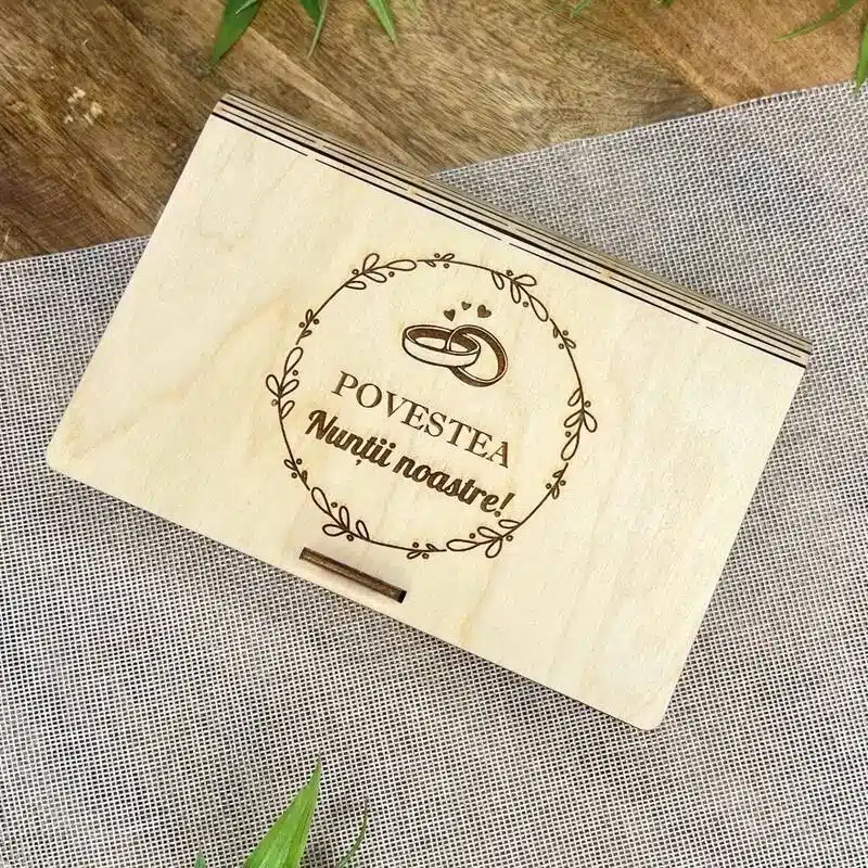 O cutie elegantă pentru păstrarea fotografiilor speciale de la nuntă. Personalizarea inclusă o face un cadou unic și memorabil pentru cupluri.