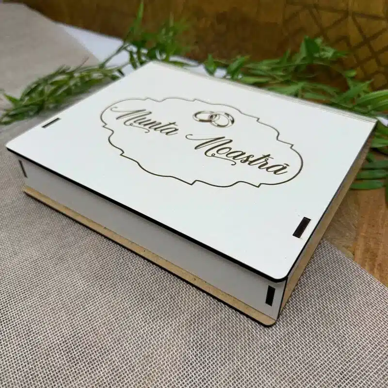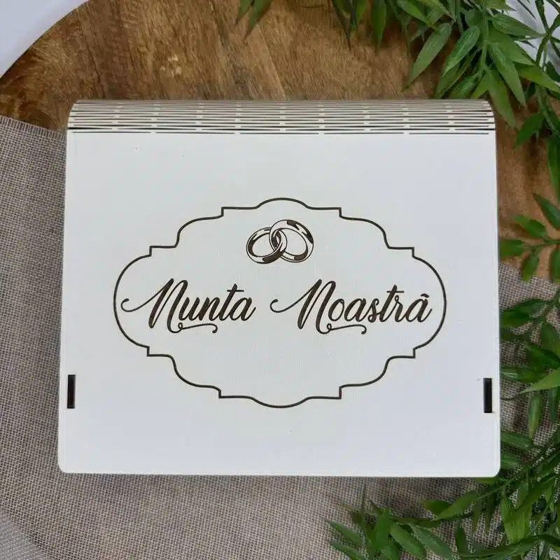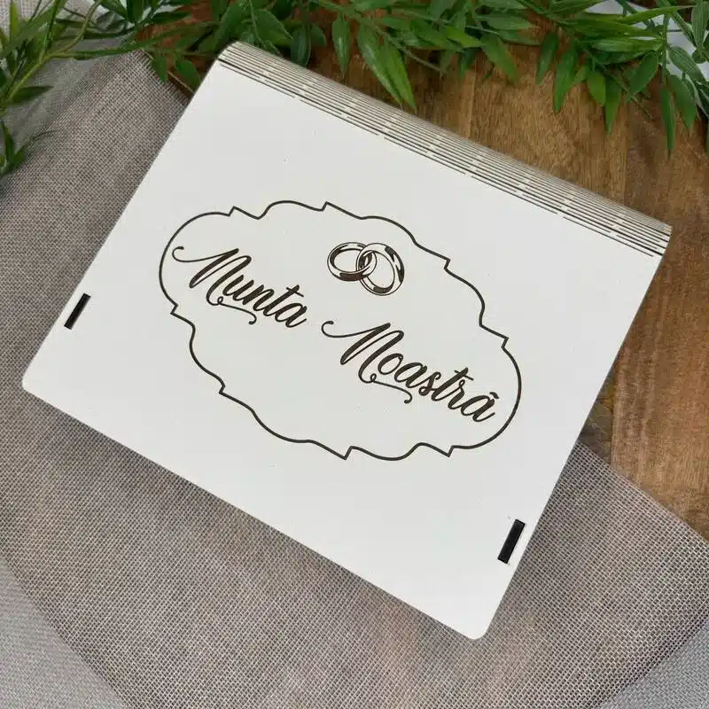 O cutie elegantă pentru păstrarea fotografiilor și a materialelor digitale de la nuntă. Personalizarea inclusă o transformă într-un cadou unic și memorabil pentru cupluri.