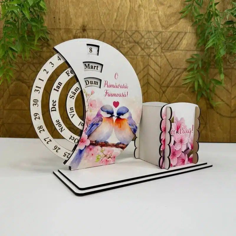 Organizator cu calendar veșnic “O Primăvară Frumoasă” este un obiect practic și decorativ, potrivit pentru birou sau spațiul de acasă. Îmbină utilitatea zilnică cu un mesaj festiv, fiind o alegere inspirată pentru aniversări și ocazii speciale.