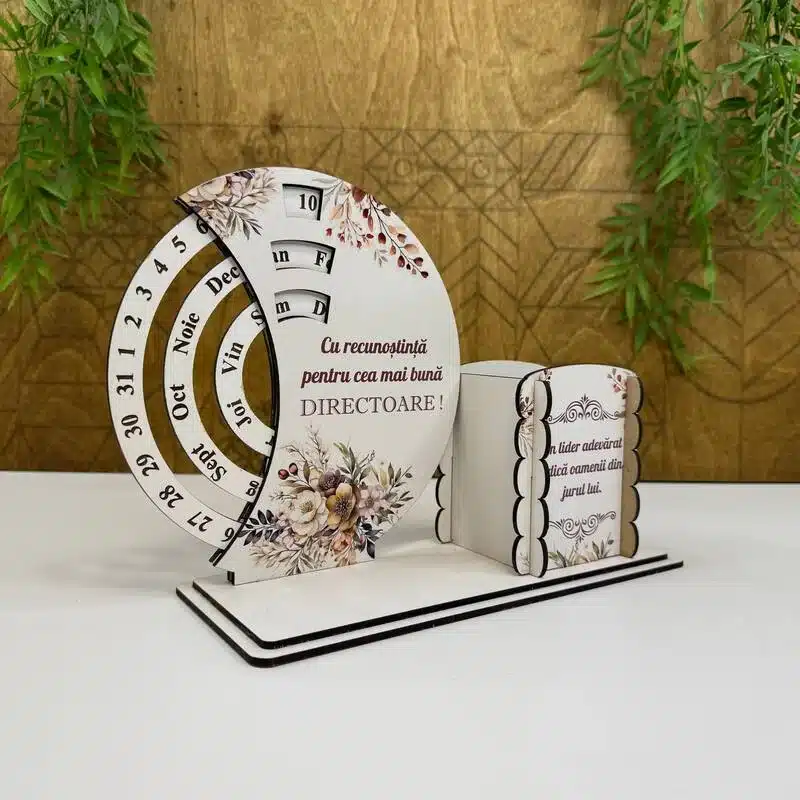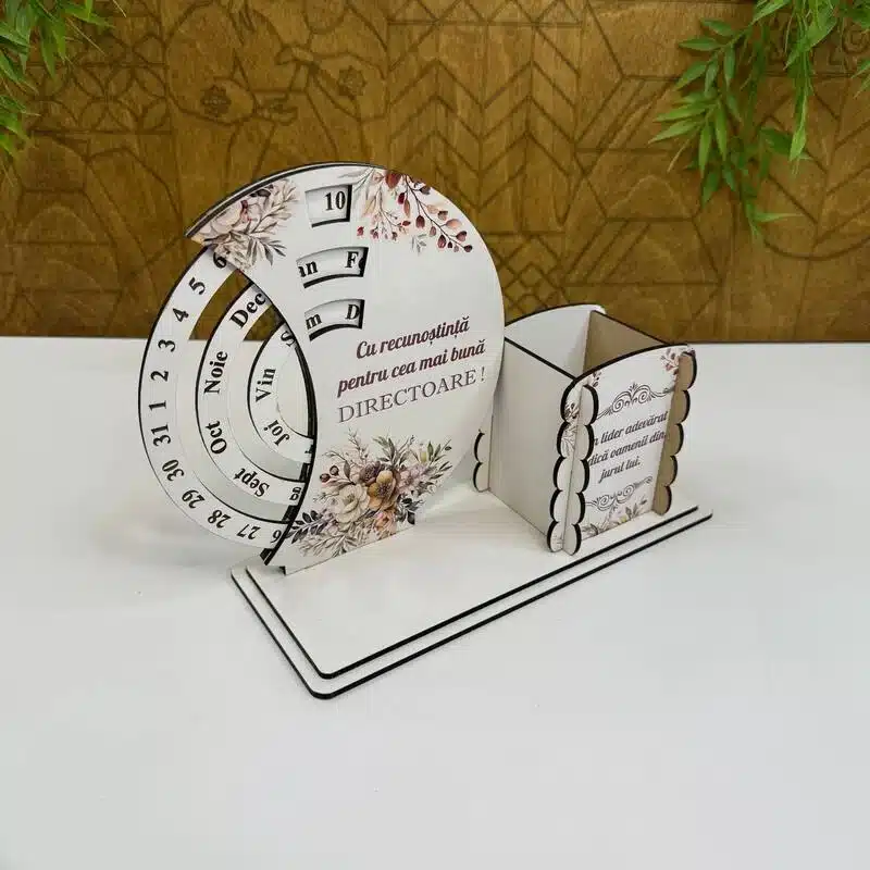 Organizatorul cu calendar veșnic personalizat este un obiect practic și decorativ, ideal pentru birou sau spațiul de lucru de acasă. Combină utilitatea zilnică cu un design curat și modern, fiind ușor de integrat în orice interior.