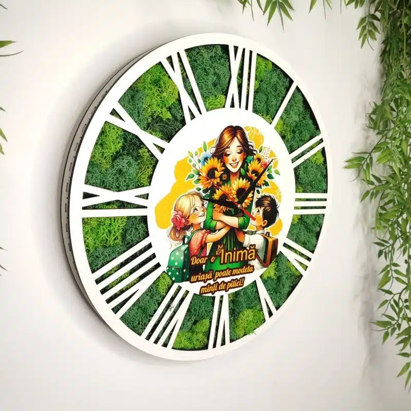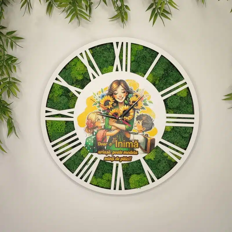 Un ceas decorativ și inspirator, realizat din MDF și decorat cu licheni, conceput pentru a adăuga o notă de natură și apreciere în spațiul de lucru al unui profesor. Ideal pentru a decora birouri, săli de clasă sau alte spații educaționale.