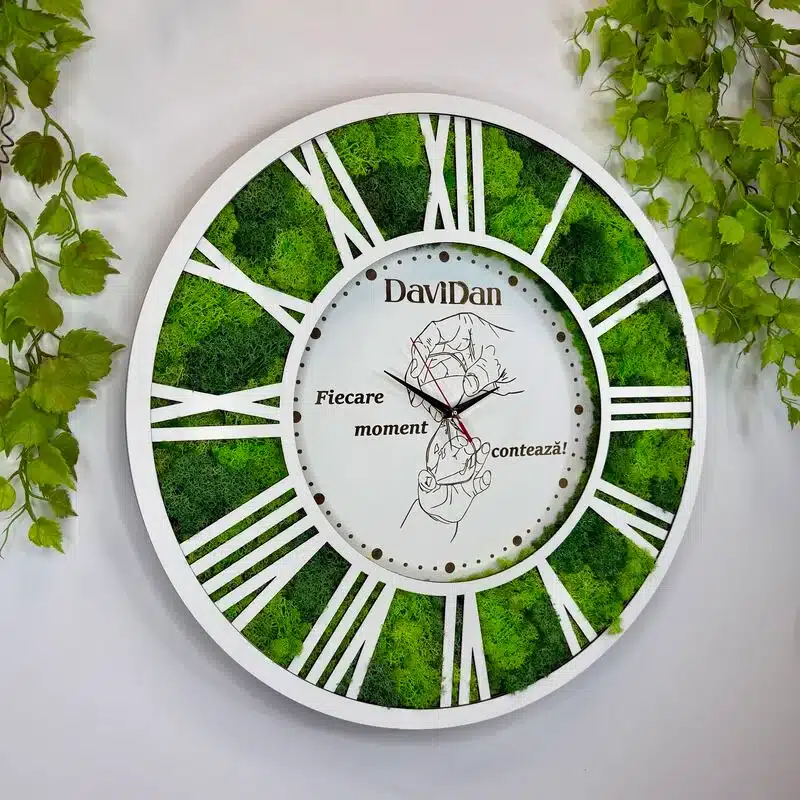 Un ceas modern și elegant, ideal pentru decorarea oricărui spațiu. Lichenii stabilizați oferă o notă naturală și un efect vizual premium.