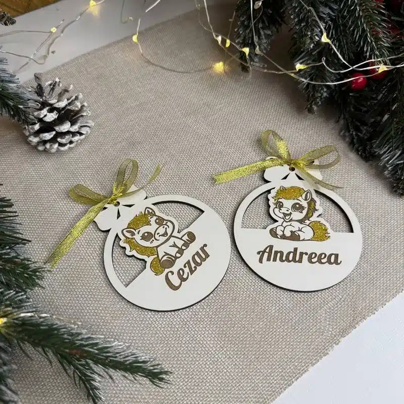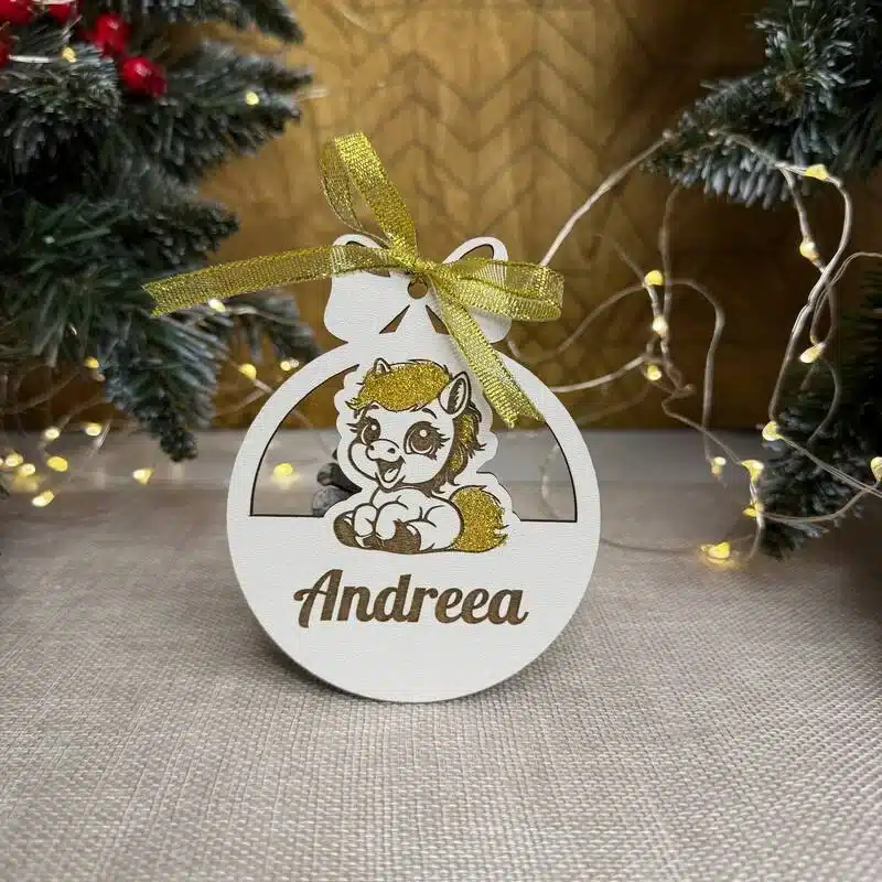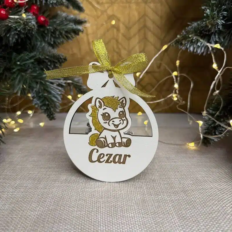 Un glob decorativ festiv, realizat din HMDF alb și personalizat cu gravură și străluciri. Ideal pentru bradul de Crăciun sau ca dar original, adăugând un plus de eleganță și veselie sărbătorilor.