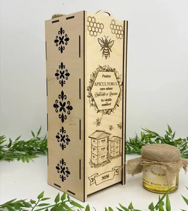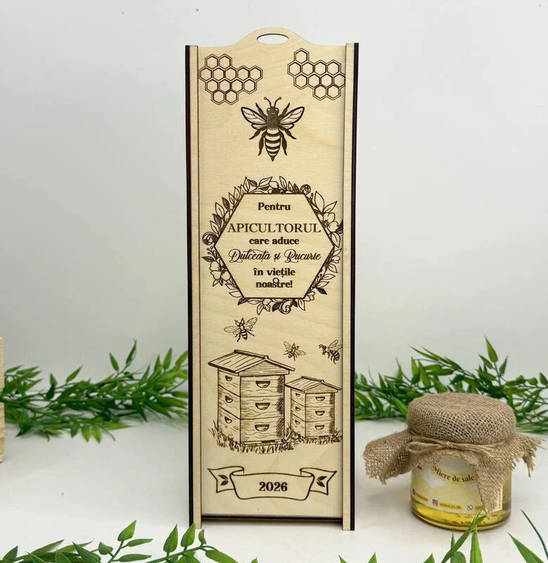Cutie pentru Sticlă de Vin “Cel mai bun apicultor” o cutie elegantă și practică, ideală pentru ambalarea și oferirea sticlelor de vin. Realizată din placaj rezistent, combină funcționalitatea cu un design simplu și rafinat.