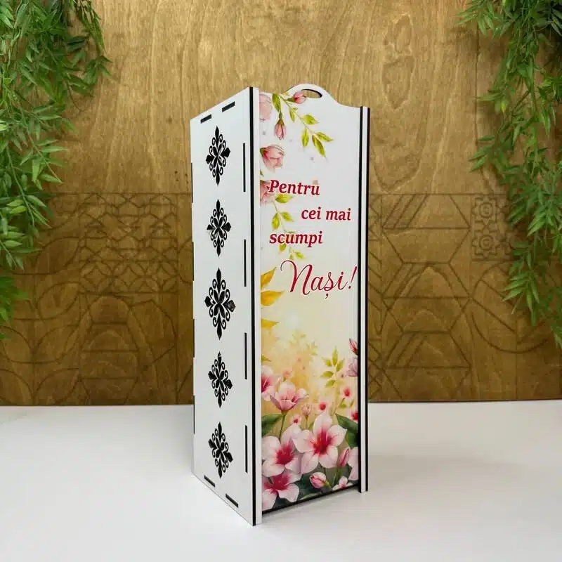Ladă decorativă realizată din HMDF alb, ideală pentru prezentarea cadourilor și realizarea seturilor festive. Designul elegant, completat de tipar decorativ, oferă un aspect curat și versatil, potrivit pentru diverse ocazii speciale.