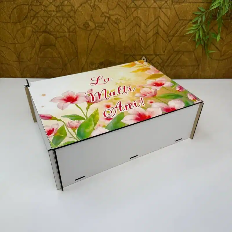 Cutia „La mulți ani” este o soluție elegantă pentru ambalarea și oferirea cadourilor aniversare, oferind o prezentare festivă și memorabilă surprizei pregătite.