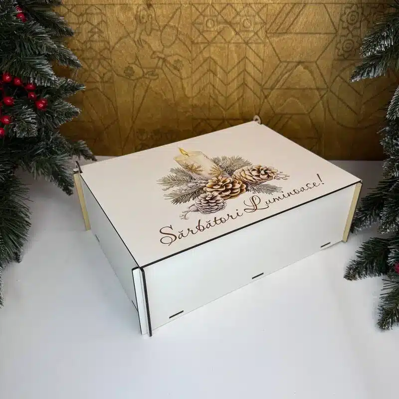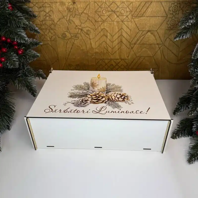 - Design: Cutie decorativă cu mesaj „Sărbători Luminoase!”, realizată cu tipar UV colorat și detalii precise.