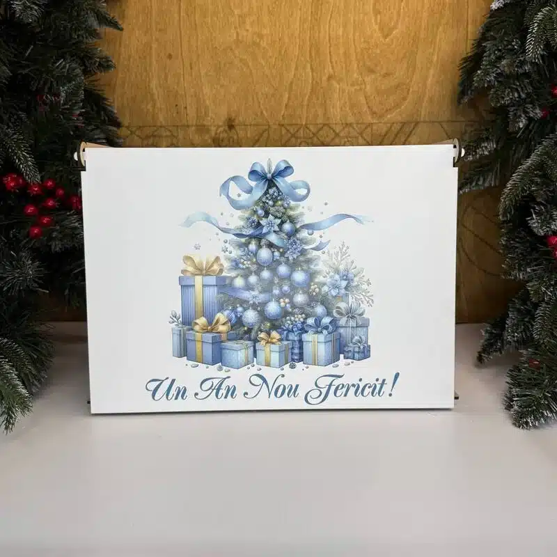 - Design: Cutie decorativă cu mesaj „Un An Nou Fericit!”, realizată cu tipar UV colorat și detalii precise.