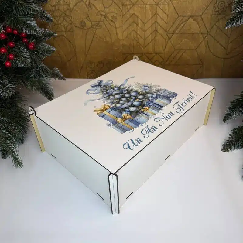 O cutie decorativă și practică, realizată din HMDF alb și personalizată prin tipar UV, perfectă pentru cadouri de Anul Nou sau evenimente festive. Designul său elegant și dimensiunea generoasă o fac ideală pentru ambalarea darurilor și oferirea unui cadou memorabil.