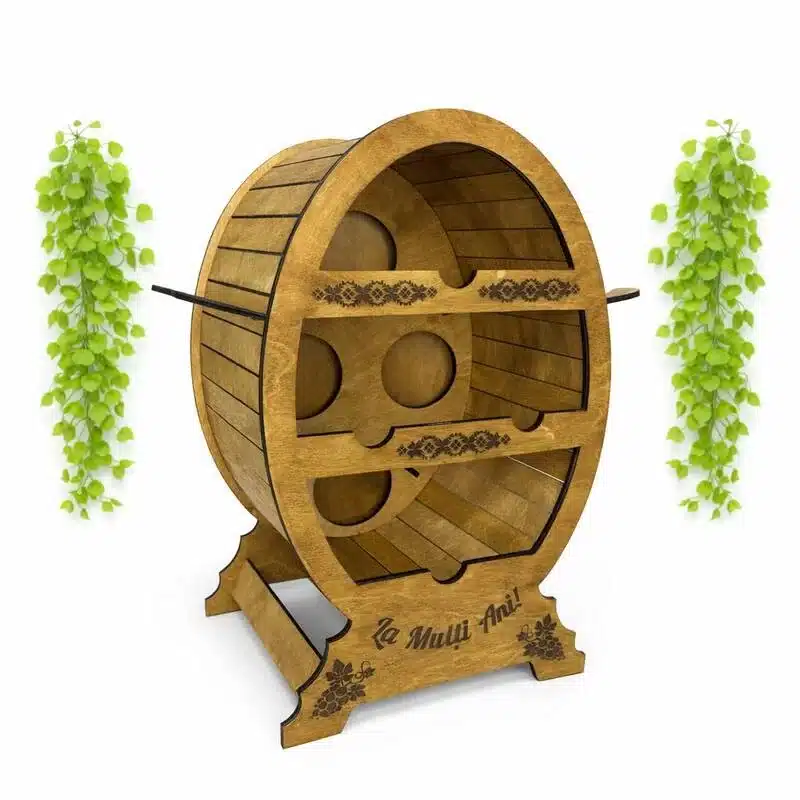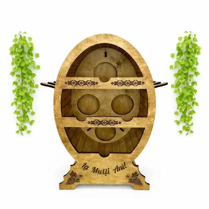 Mini Bar “Butoi” – Un mini bar elegant și funcțional, realizat din placaj, perfect pentru a stoca și expune sticlele de vin și paharele. Ideal pentru a adăuga un strop de stil și organizare în orice spațiu.