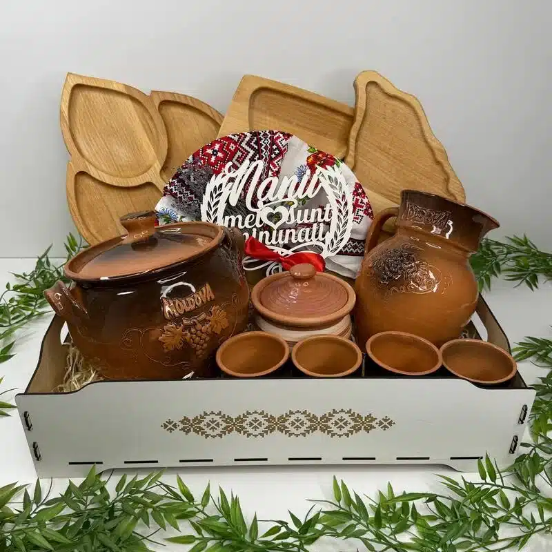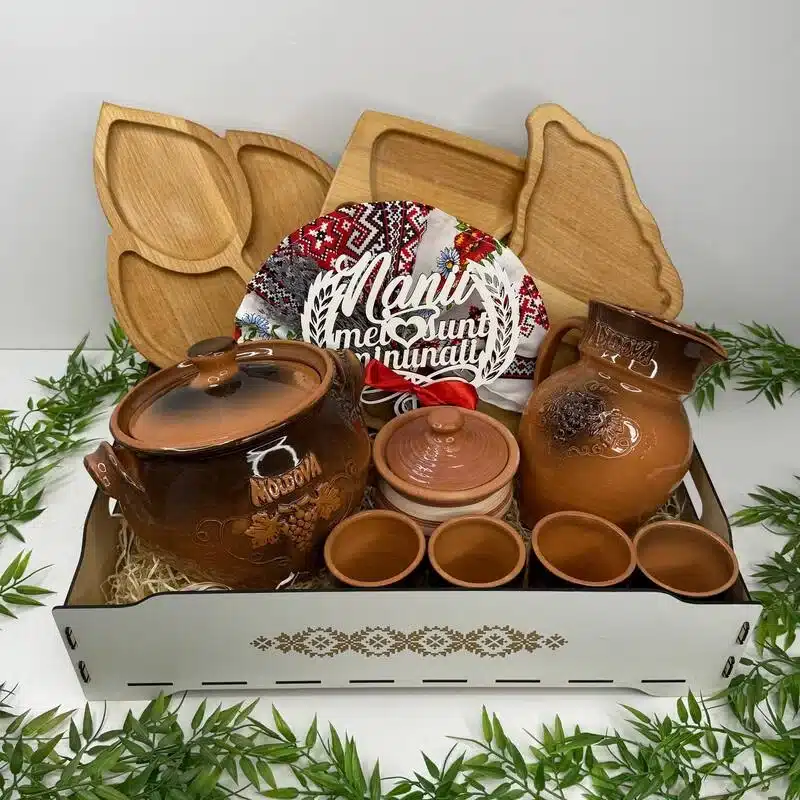 Un set tradițional deosebit, pregătit pentru a fi oferit Nani-lor într-un moment special. Combinația dintre elementele din lemn și ceramică, completate de detalii decorative, creează un aranjament festiv și armonios.