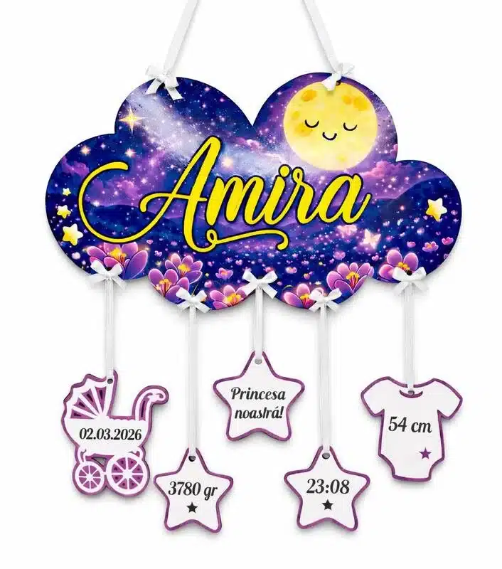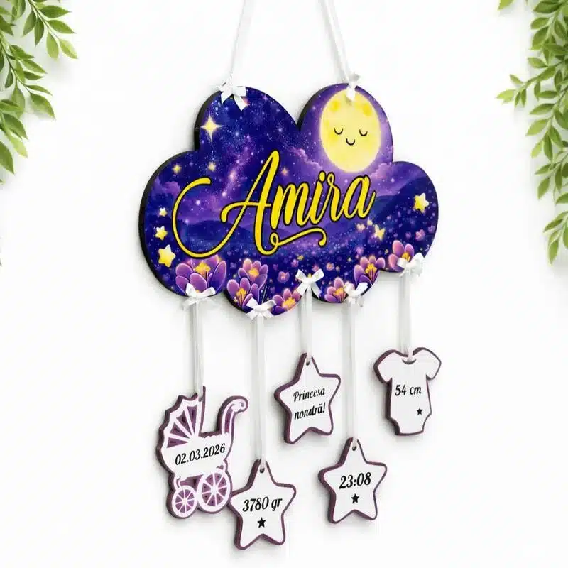 - Design: O placă decorativă, cu un aspect drăguț și cald, care evidențiază detaliile de la nașterea bebelușului.