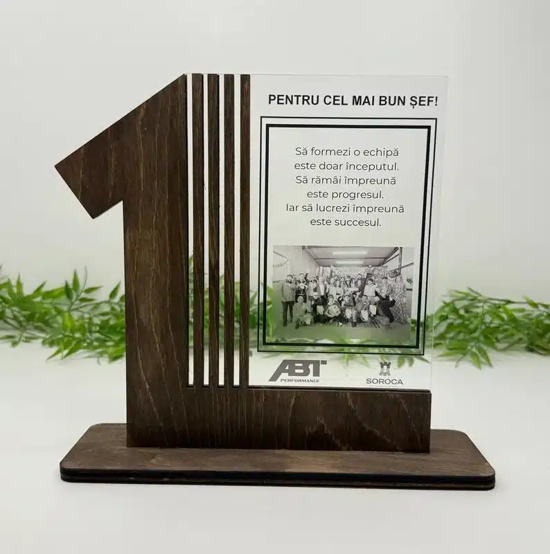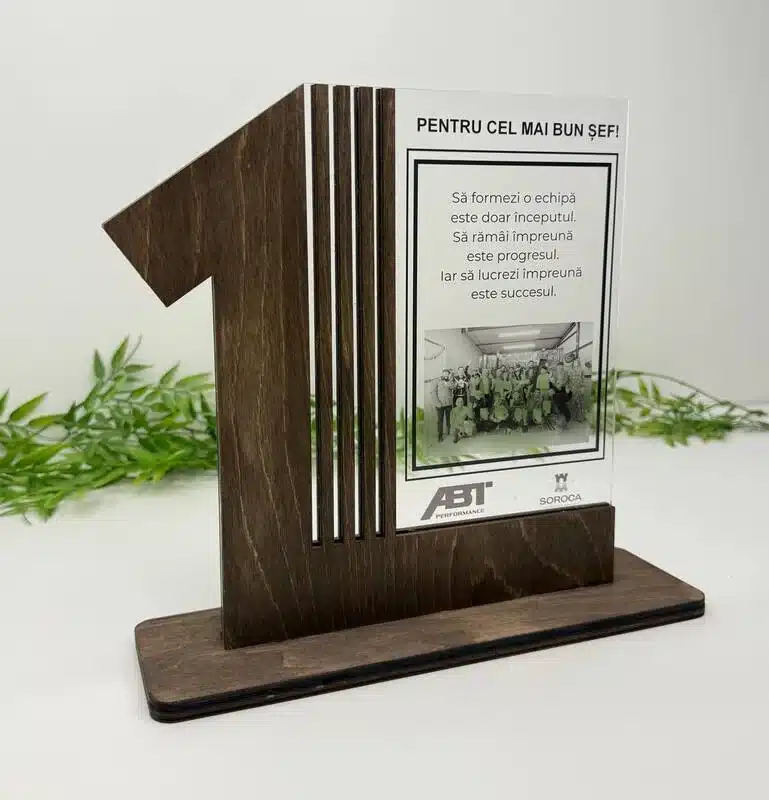 Un trofeu elegant și modern, creat pentru a evidenția performanța și a oferi recunoaștere într-un mod deosebit. Combinația dintre placajul natural și sticla organică oferă un aspect premium și rafinat.