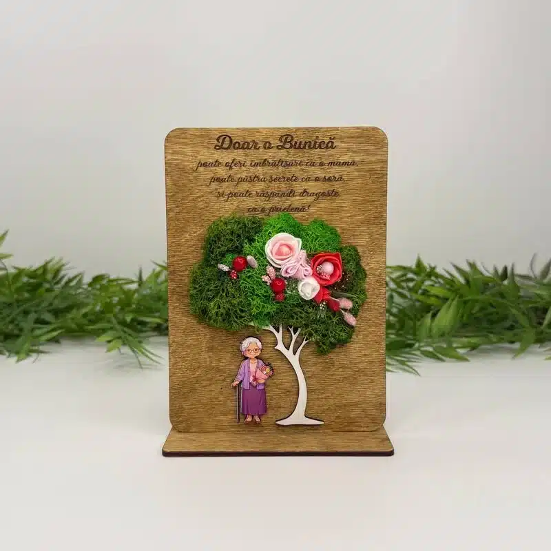 Un trofeu decorativ, realizat cu grijă pentru a transmite apreciere și dragoste celei mai dragi bunici. Combinația dintre gravură și licheni stabilizați oferă un aspect natural și elegant.